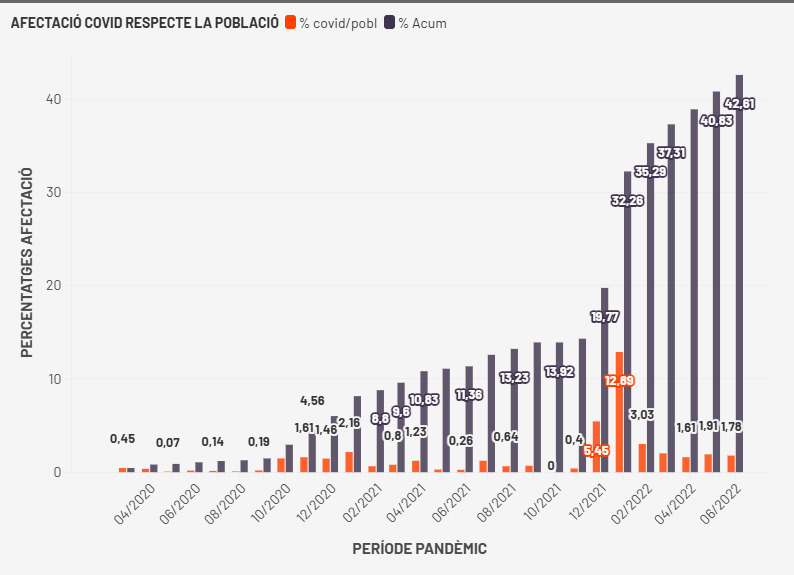 dades històriques dels cassos reportats de covid19 al municipi d'artés entre el mes de març de l'any 2020 i el juny de l''any 2022 i acumulat total relatius a la població total